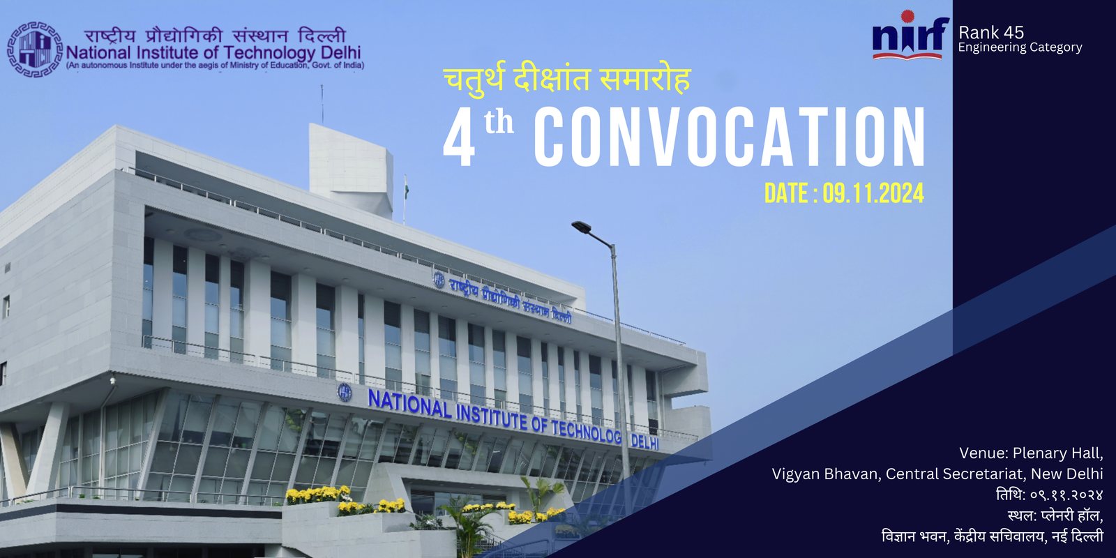 Greetings and a Warm Welcome all at National Institute of Technology Delhi, India. I am delighted to announce that the Convocation Ceremony for the graduating class of 2023 and 2024 will be held on 09th November, 2024 at Vigyan Bhawan, New Delhi. This event marks a significant milestone in the academic journey of our students and celebrates their hard work, dedication, and achievements.
