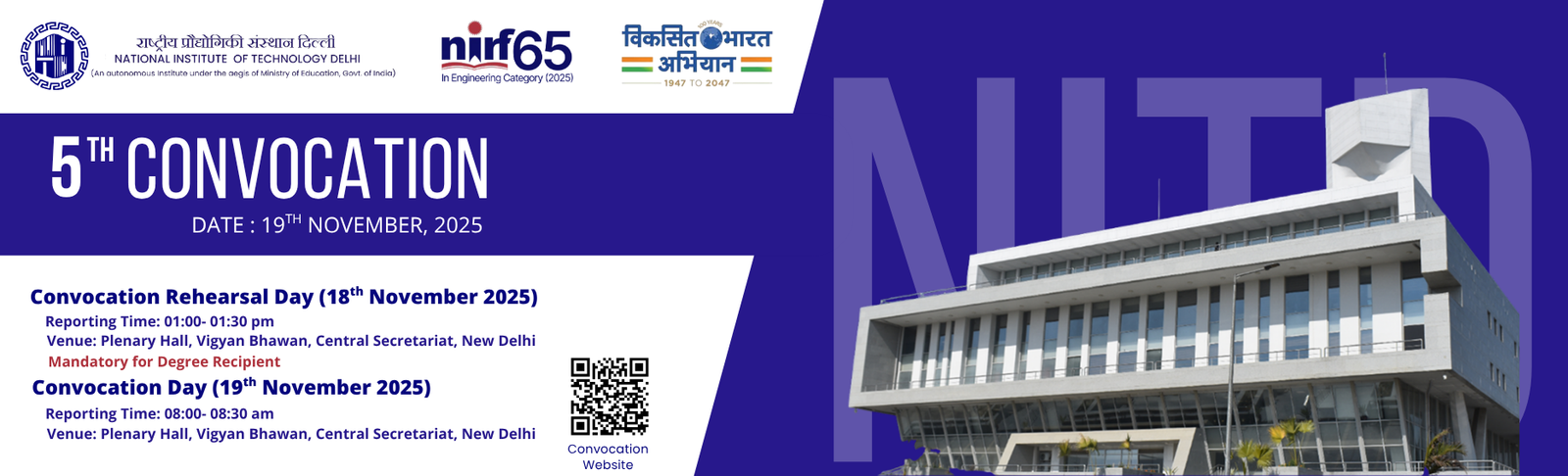 Greetings and a Warm Welcome all at National Institute of Technology Delhi, India. I am delighted to announce that the Convocation Ceremony for the graduating class of 2025 will be held on 19th November, 2025 at Vigyan Bhawan, New Delhi. This event marks a significant milestone in the academic journey of our students and celebrates their hard work, dedication, and achievements.